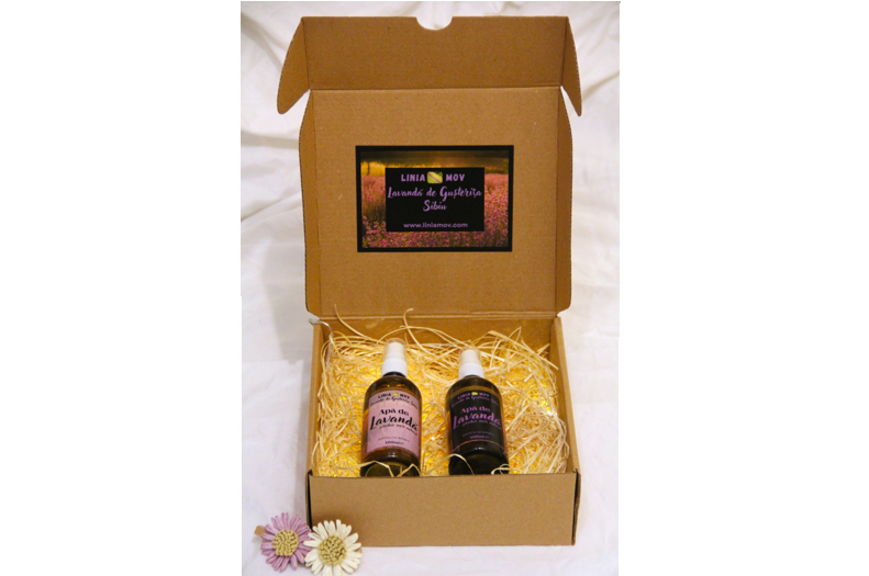 - 2 sticle de 100 ml cu apă florală de lavandă (recipient din sticlă brună cu pulverizator)