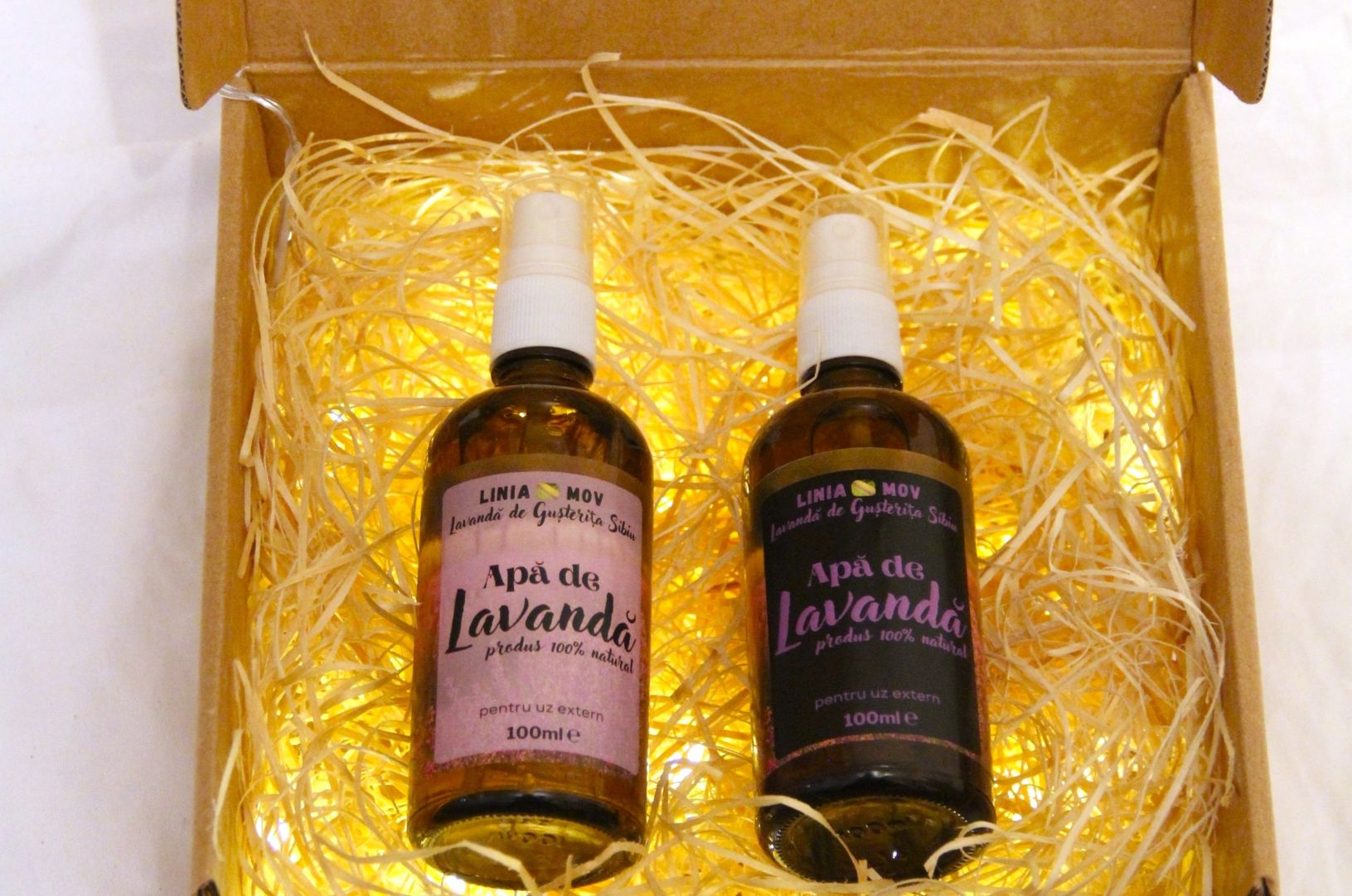 - 2 sticle de 100 ml cu apă florală de lavandă (recipient din sticlă brună cu pulverizator)