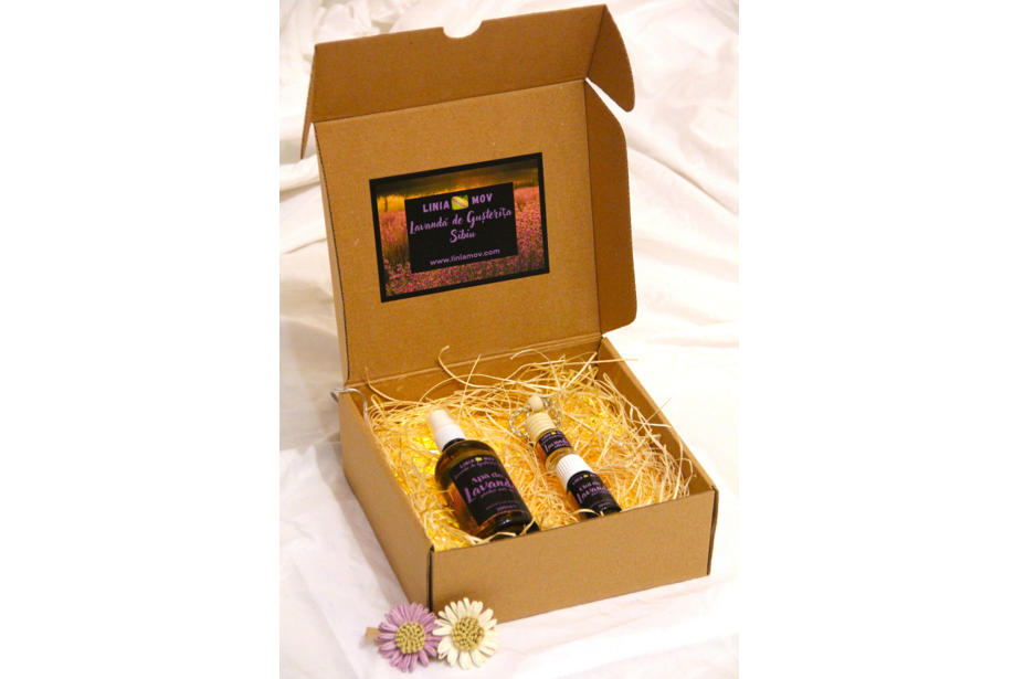 - 1 sticlă de 100 ml cu apă florală de lavandă (recipient din sticlă brună cu pulverizator)